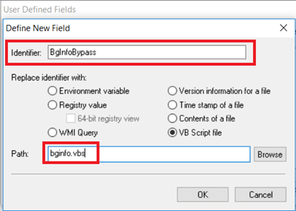 Note that you type in bginfo.vbs and not the entire path (That will happen if you browse). If you type in just the filename the script file must be located within the same folder.