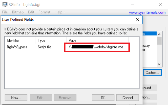 BGinfo.exe older than version 4.22 can be used to bypass application whitelisting using vbscript inside a bgi file. This can run directly from a webdav server.