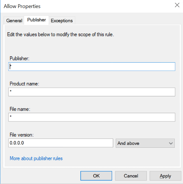 In this section we encounter our first Publisher rule. The rule named “(Default Rule) All digitally signed Windows Installer files” will allow every digitally signed Windows installer file to execute.