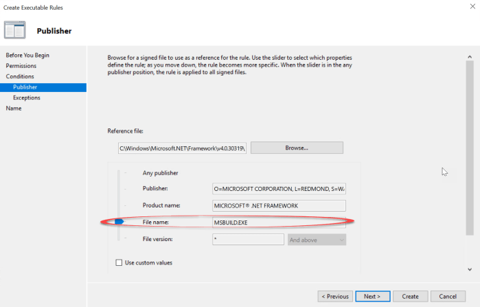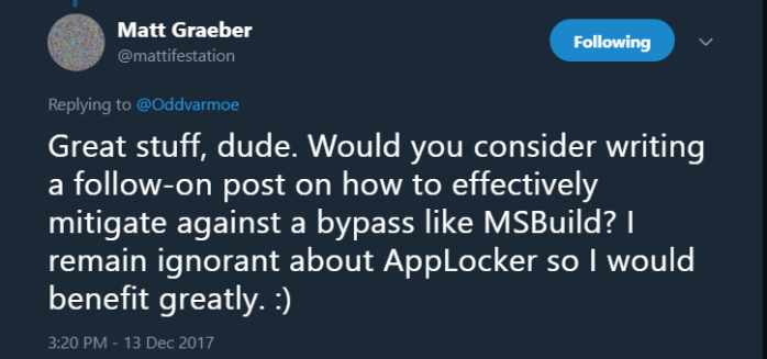 In my post about how insecure AppLocker really are we concluded that the only valid bypass technique (from the 7 I tested) was actually msbuild.exe. The next question is, how can we mitigate this to harden the default setup?
