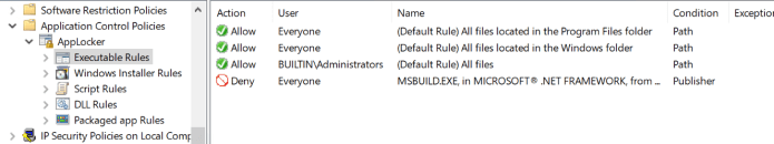 In this post I will cover how to go beyond the default rules in AppLocker and harden it to prevent msbuild.exe from working. I will explain different methods of mitigating using AppLocker. But before we dive into rule making, let me first explain the default rules in detail.
