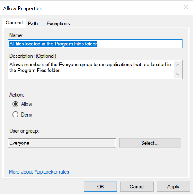The first rule named “(Default Rule) All files located in the Program Files folder” makes sure that everyone can execute any binary file located within “Program files” and “Program files(x86)”.