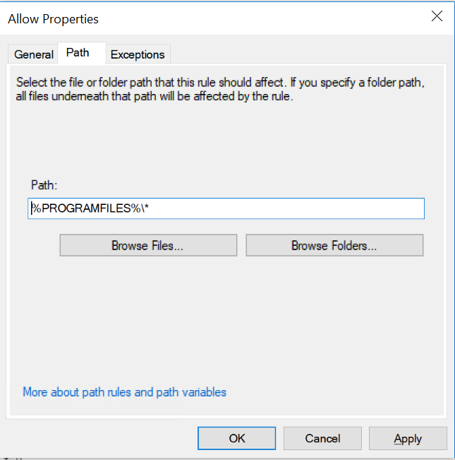 Notice the %PROGRAMFILES% variable. This is a special AppLocker variable. As you probably understand from the %PROGRAMFILES%\* path, it means that everything under programfiles can be executed. %PROGRAMFILES% actually refers to both “Program files” and “Program files(x86)”