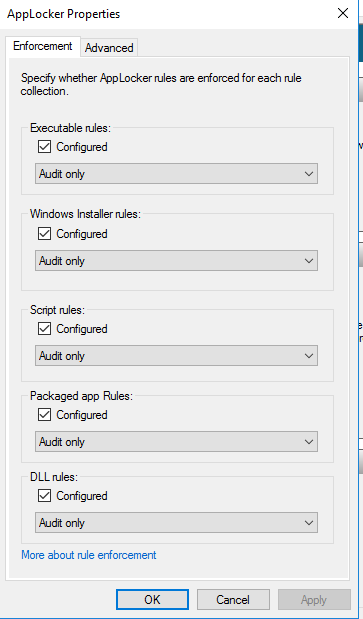After I imported the rules I noticed that the rules apply for a specific version of the different files. I wanted to change that so that I did not have to remake this policy every time there is a new version or build. I did this by manually editing the XML file. Replacing LowSection=”versionnumber” with LowSection=”*” (and the same for HighSection). After I was done editing it I re-imported it to the AppLocker Group policy object and added rules to the different sections allowing administrators to run everything (every rule is wiped when you import). I also changed the enforcement to “Enforce rules” in each section.