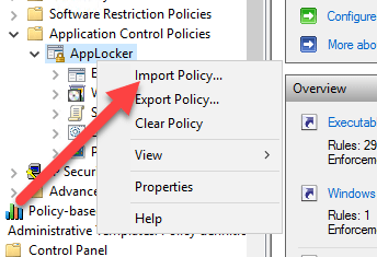 After the rules was created I then imported them to my AppLocker policy. You do that in the Group Policy editor by right clicking on the AppLocker part and selecting import.