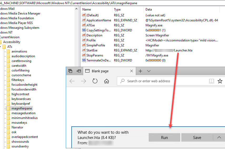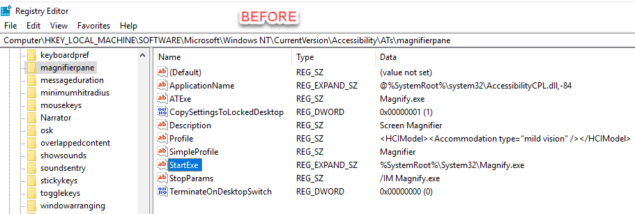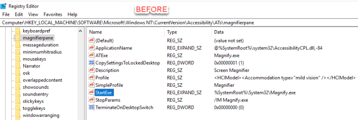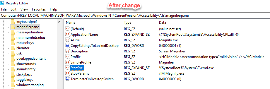 Okay, so how do we change this so that for instance the magnifier launches something else instead? That is pretty straight forward as explained in @hexacorn’s blog mentioned above. You just go into the correct registry path and change the StartExe Reg_Expand_SZ to something else.