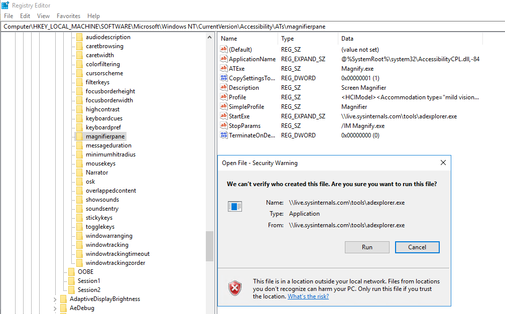 A while back I did some digging around the Assistive Technology (ATs). ATs are things like magnifier, sticky keys and more. All of these are registered in registry under the following registry location: