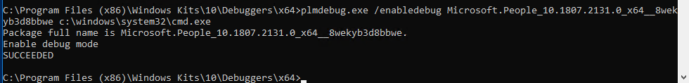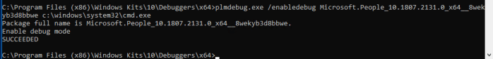 plmdebug.exe /enabledebug Microsoft.People_10.1807.2131.0_x64__8wekyb3d8bbwe c:\windows\system32\cmd.exe
